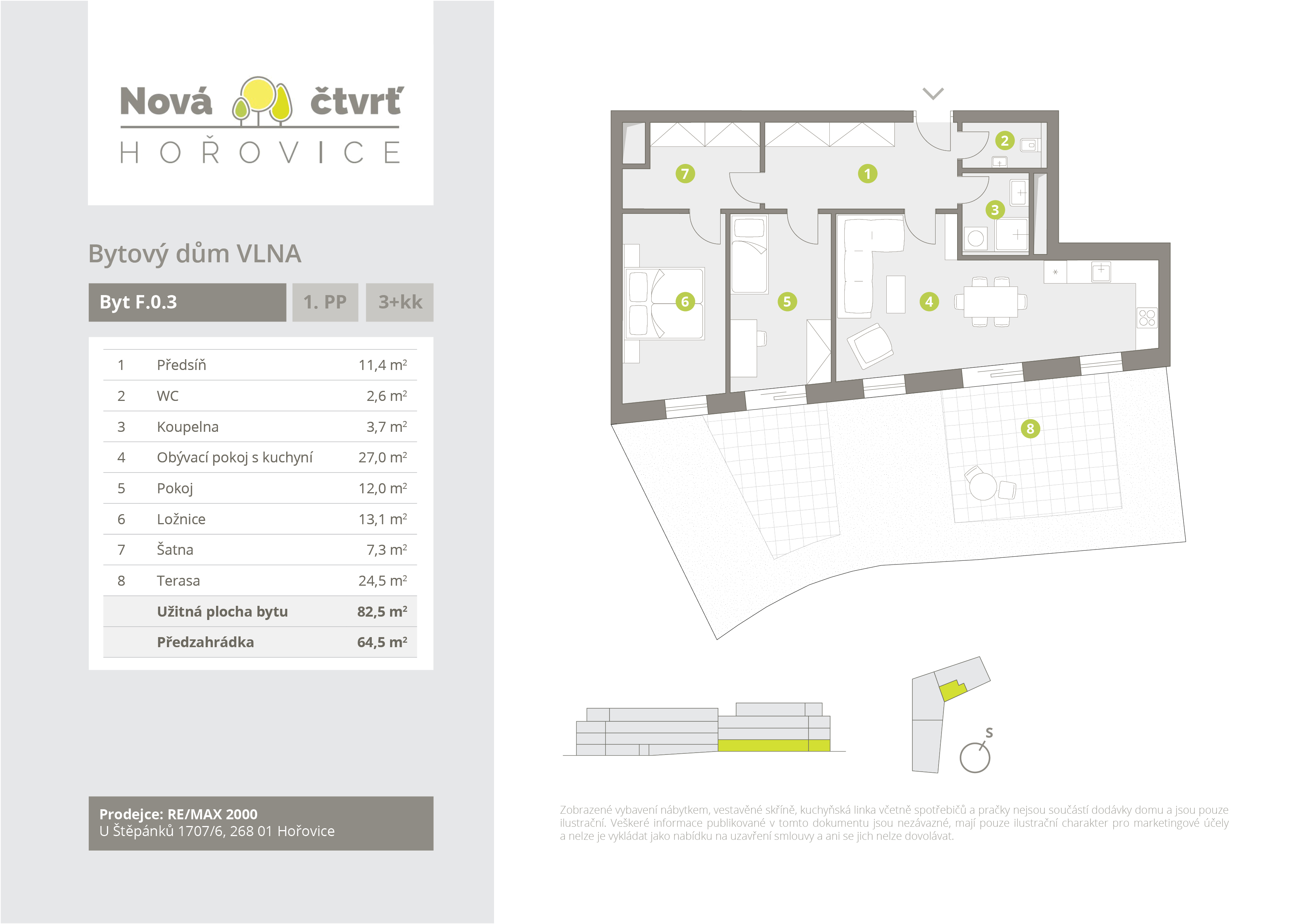 Možnost dokoupení parkovacího stání za 250.000 Kč. Uvedená cena zahrnuje variantu bytu v základním provedení (co je součástí základního provedení najdete na webových stránkách v sekci Standardy), cena dále zahrnuje podlahové topení a přípravu na venkovní žaluzie. Budoucí majitel si může vybrat zařizovací předměty, podlahy, interiérové dveře, obklady a dlažby dle svého vkusu.