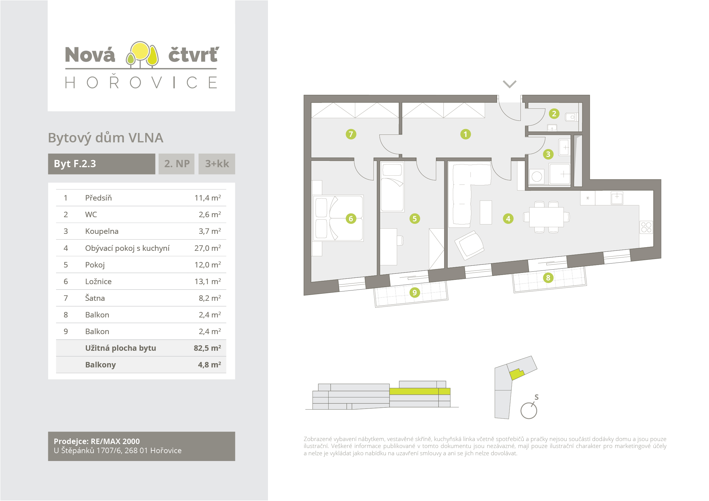 K bytu náleží dva balkóny. Možnost dokoupení parkovacího stání za 250.000 Kč. Uvedená cena zahrnuje variantu bytu v základním provedení (co je součástí základního provedení najdete na webových stránkách v sekci Standardy), cena dále zahrnuje podlahové topení a přípravu na venkovní žaluzie. Budoucí majitel si může vybrat zařizovací předměty, podlahy, interiérové dveře, obklady a dlažby dle svého vkusu.